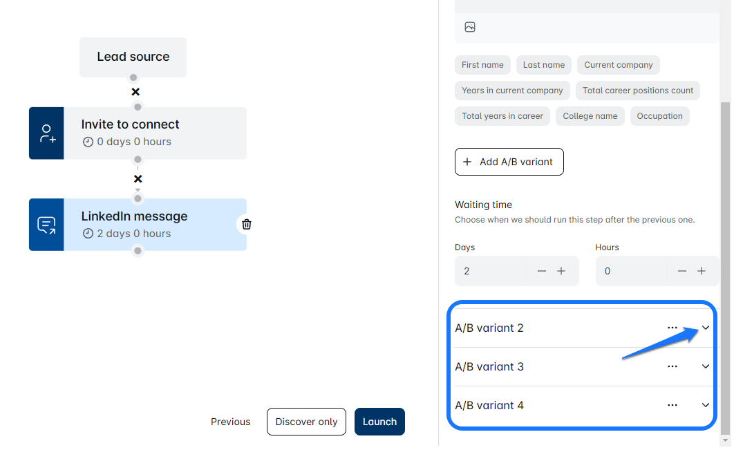 - In LeadYoda.co, you can test different parts of your message copy, such as LinkedIn messages, Emails, InMails, Invites to Connect, or even the timing between the steps during the campaign sequence creation process. You can create up to 5 different test variants!